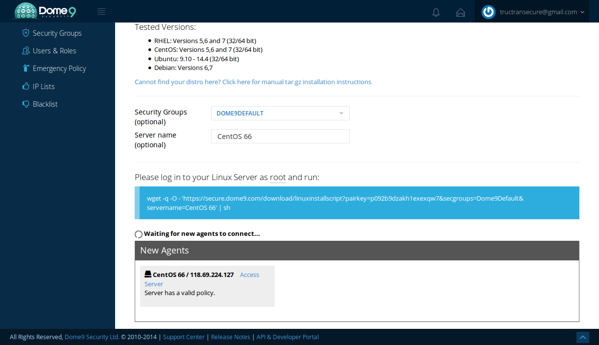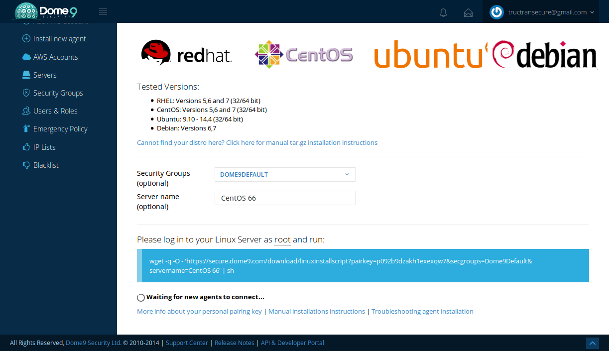 Agent có chức năng kết nối đến máy chủ Dome9 để tải các thiết lập tường lửa và áp dụng cho server. Việc cài đặt tương đối dễ dàng, chỉ chọn vào icon tương ứng (Windows hoặc Linux) sẽ có hướng dẫn cụ thể.