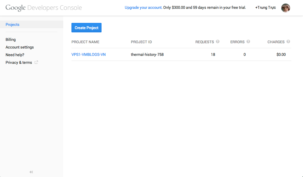 Đây là giao diện khi chúng ta đăng nhập Google Developers Console. Sở dĩ có tên Google Developers Console là do trong nền tảng Cloud của Google có rất nhiều công cụ phát triển, không chỉ đơn thuần module xử lý mà chúng làm việc trong bài này.