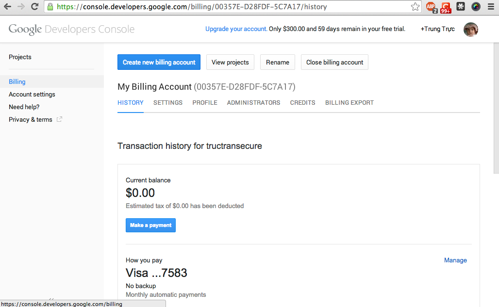 Mục Billing có thể nói ngắn gọn là mục tính tiền sử dụng, chúng ta có thể xem là đã sử dụng những gì và tốn bao nhiêu. Tuy nhiên chỉ sử dụng thành phần xử lý compute unit nên thiết nghĩ khó mà sừ dụng hết được mức tín dụng mà Google đã cung cấp.