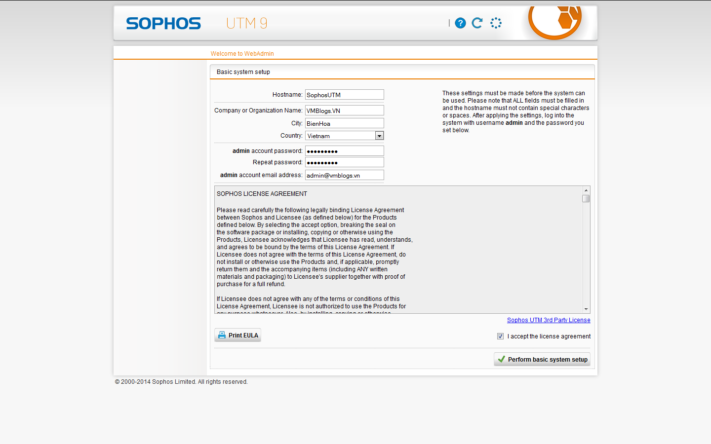 Ở phần trước chung ta đã cài đặt thành công Sophos UTM Home lên máy tính. Ở bài này chúng ta tiếp tục với các thiết lập cơ bản đầu tiên.
