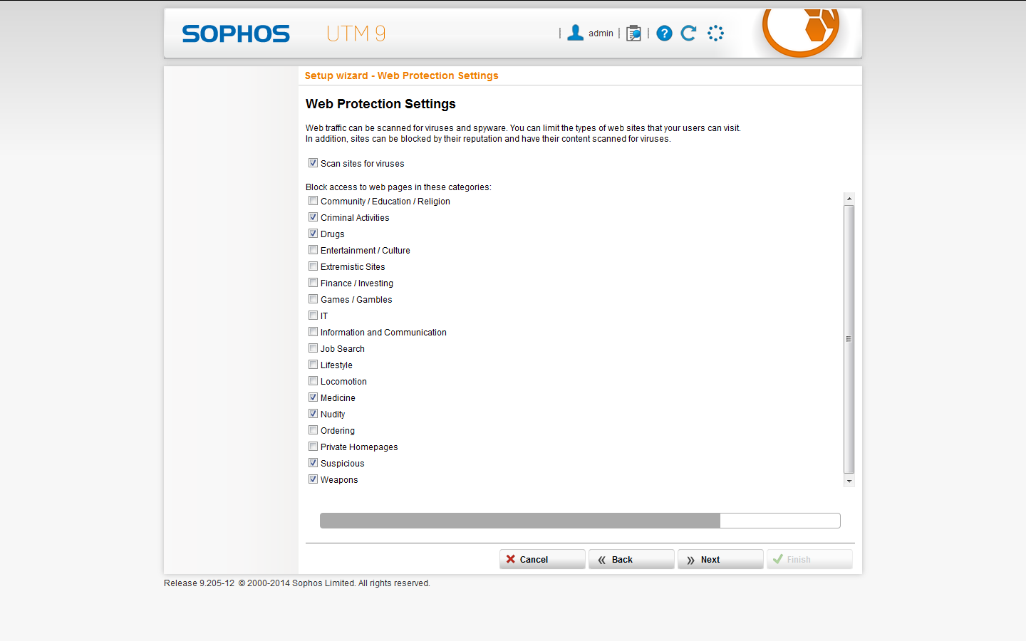 Ở phần này cho phép cấu hình cơ bản các hạng mục lọc web. Trong ảnh mình bật chức năng quét virus cho các trang web cần truy cập cũng như chặn các danh mục web không mong muốn như tội phạm, ma túy, thuốc, sex, vũ khí và các trang web thuộc dạng đáng nghi.