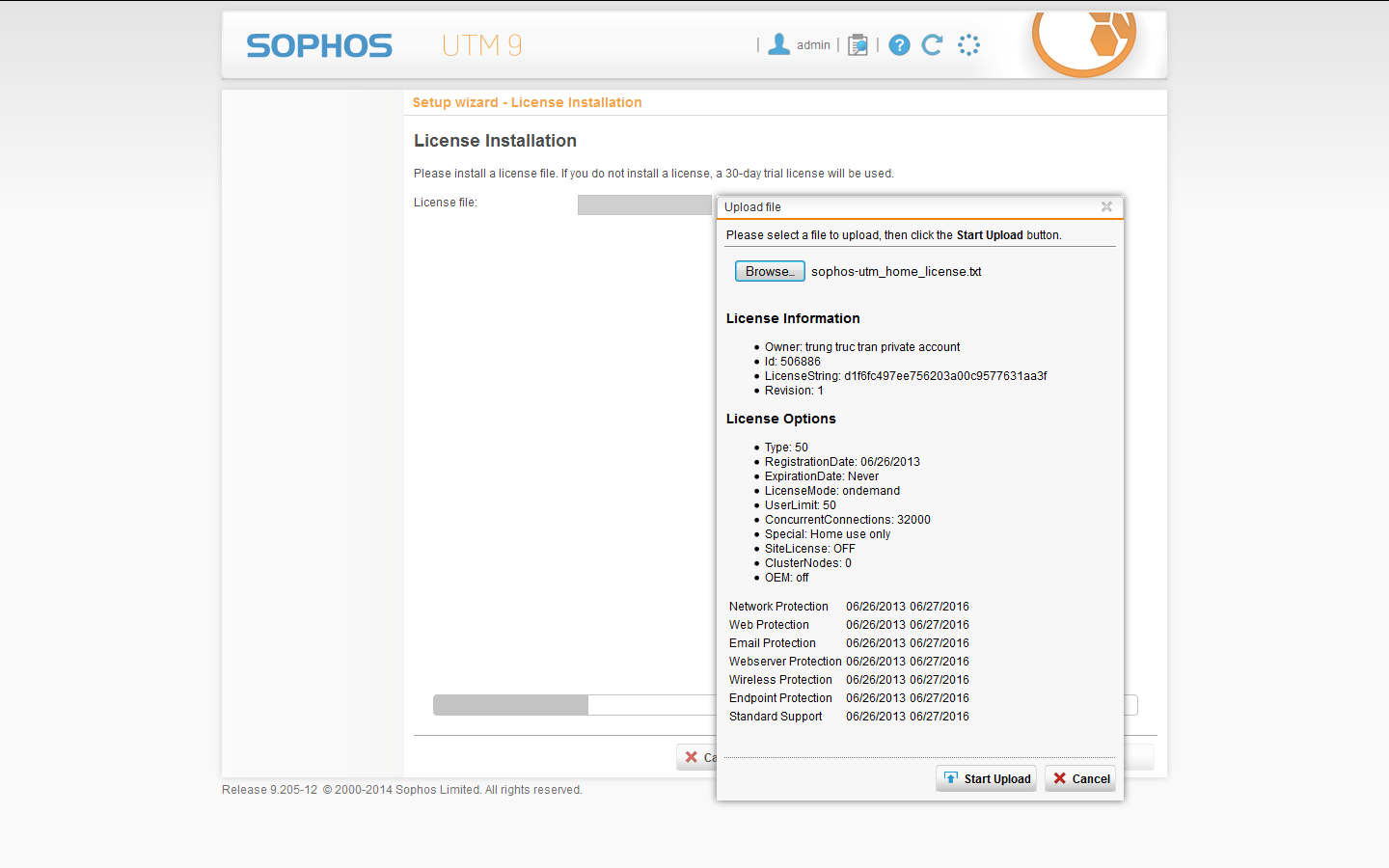 Chọn file license đã lưu ở phần 1 để nhập vào Sophos UTM Home.