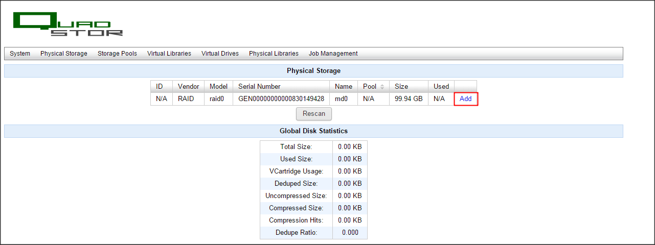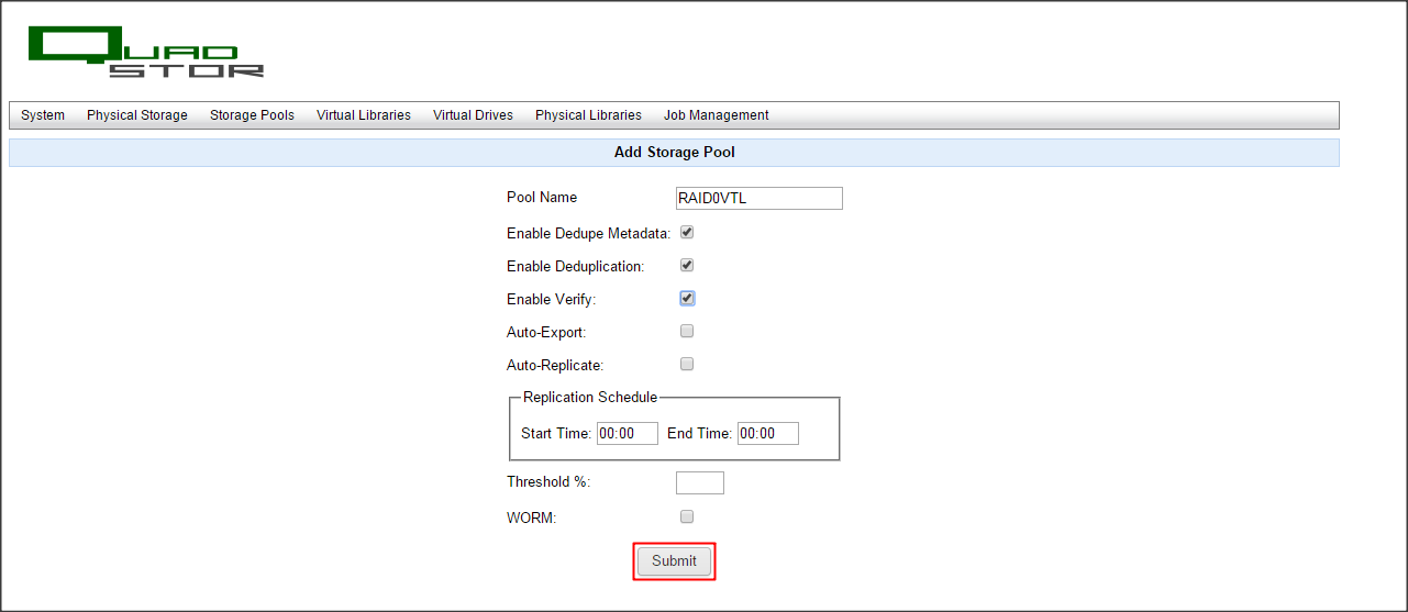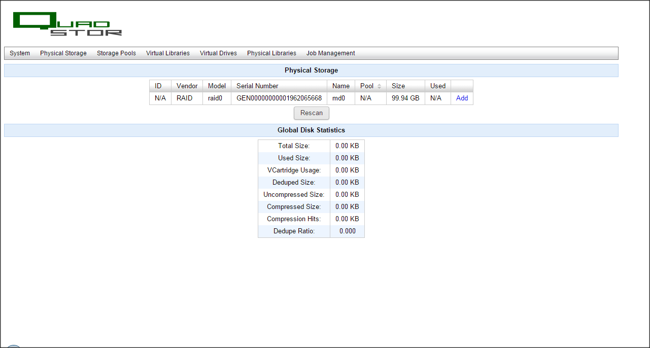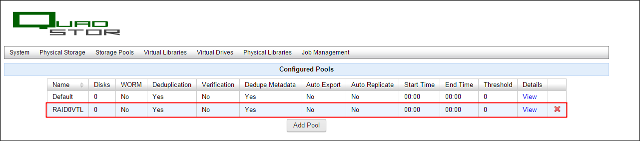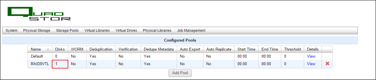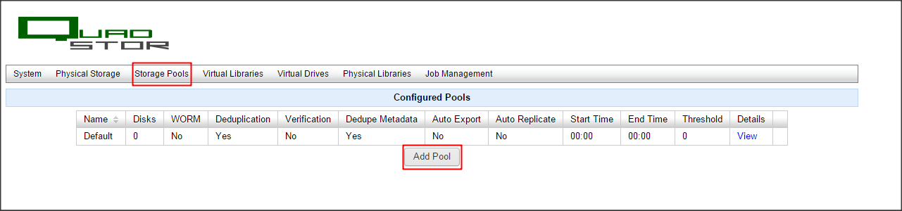 Do QuadStor giả lập các thiết bị tape cần nơi lưu trữ do đó để có thể vận hành chúng ta cần phải cấu hình Storage Pool làm nơi chứa dữ liệu.