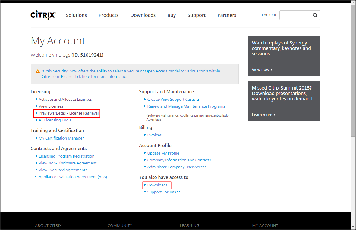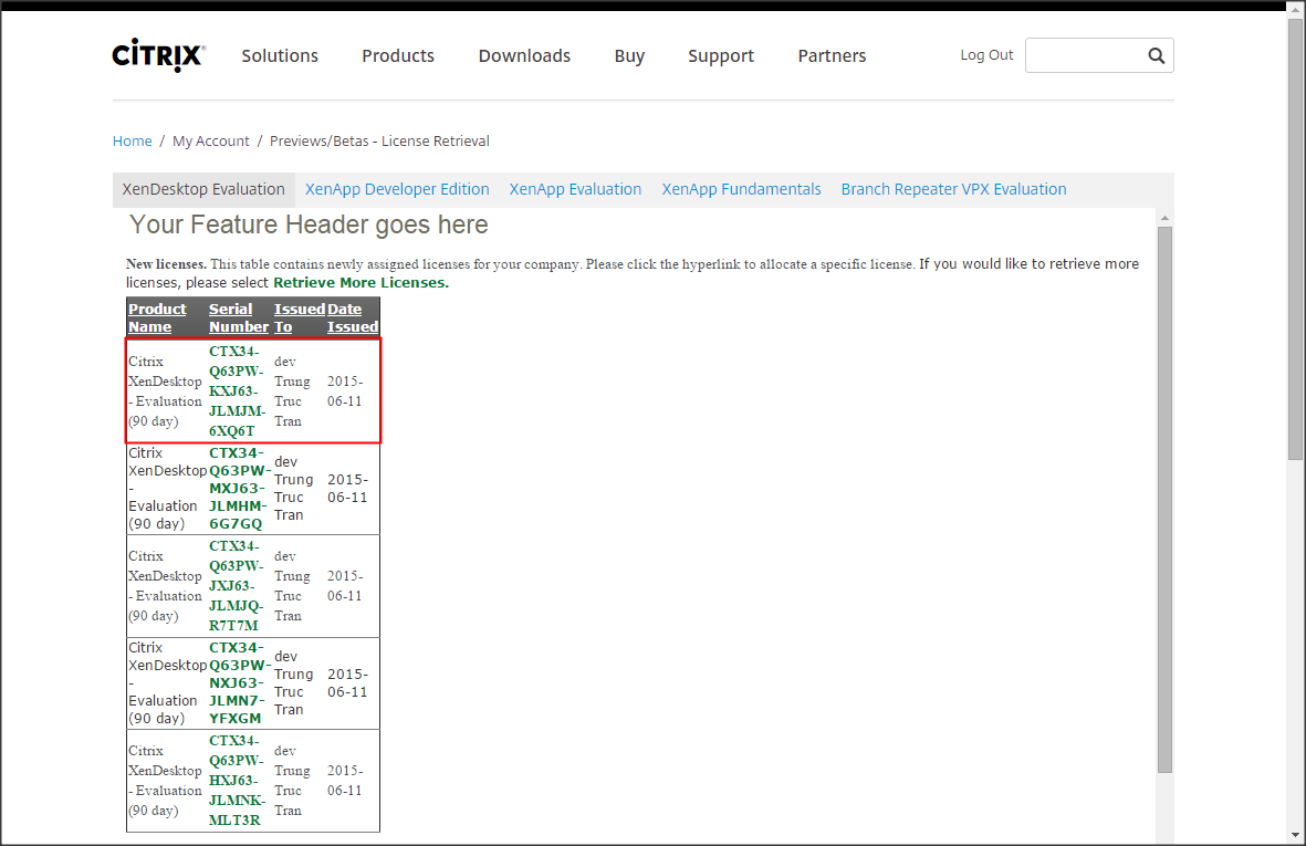 Trong mục Preview/Betas – License Retrieval có sẵn các mục key bản quyền dùng thử cho các sản phẩm chính của Citrix