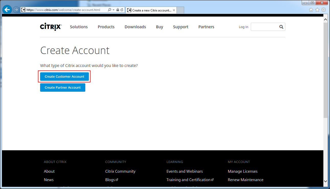 Để tiến hành đăng ký tài khoản, các bạn truy cập trang web https://www.citrix.com/welcome/create-account.html và click chọn Create Customer Account