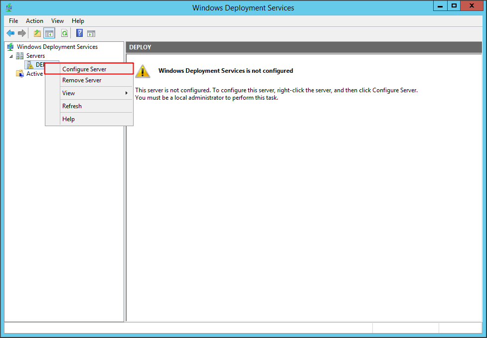 Mở cửa sổ Windows Deployment Services, click chuột phải vào tên server và chọn Configure Server