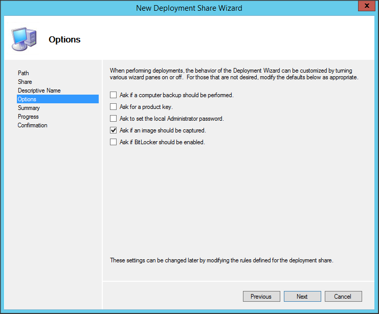 Một vài tùy chọn cho Deployment Share, có thể tùy chỉnh sau. Ở đây mình chọn Ask if an image should be captured