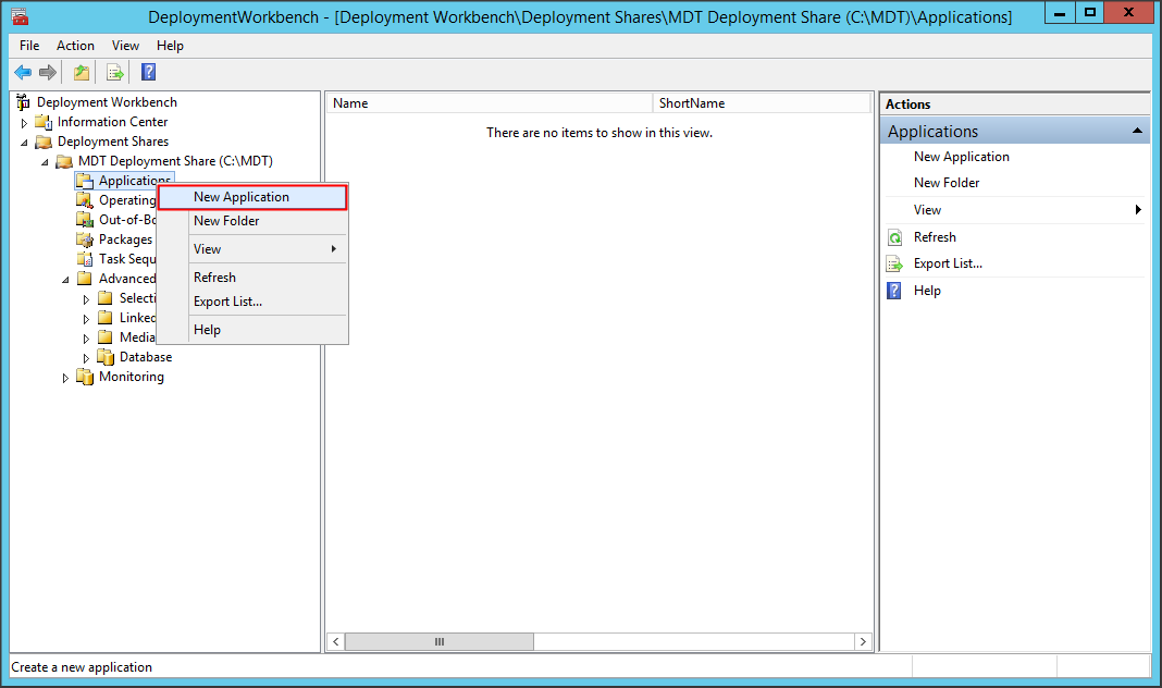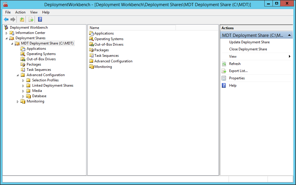 Như các bạn cũng thấy thì Deployment Workbench chia ra thành nhiều mục như Application để lưu các thông tin về phần mềm, Operating system cho hệ điều hành, Out-of-box driver cho trình điều khiển thiết bị, Packages cho các bản vá lỗi (nếu có), Task Sequences lưu các thông tin quy trình và thứ tự hoạt động của các tác vụ khi deploy hệ điều hành