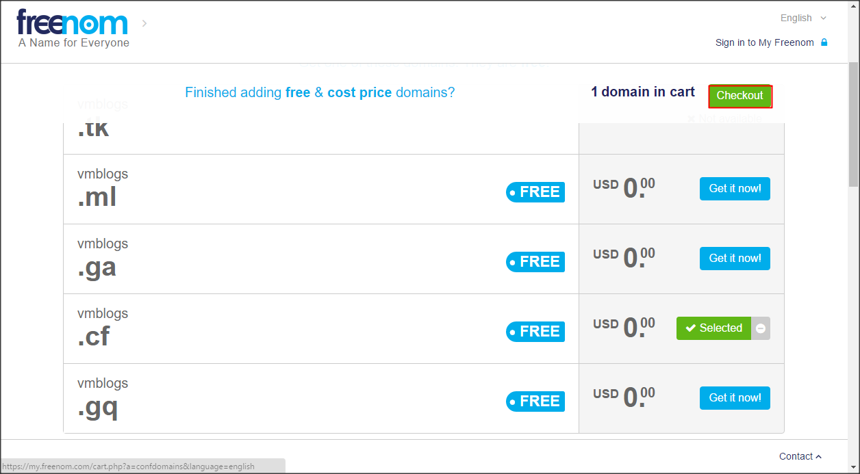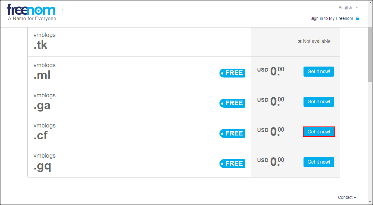 Freenom sẽ liệt kê ra các tên miền tương ứng đang có sẵn, các bạn chọn tên miền phù hợp nhất cho mình. Có 5 tên miền miễn phí đó là .tk, .ml, .ga, .cf, .gq
