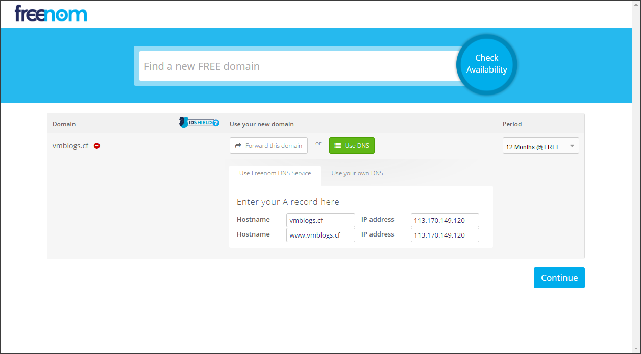 Chọn Use DNS, nhập IP tạm tương ứng với tên miền, chọn thời gian sử dụng tên miền (hết thời hạn sẽ có tùy chọn renew để sử dụng tiếp)