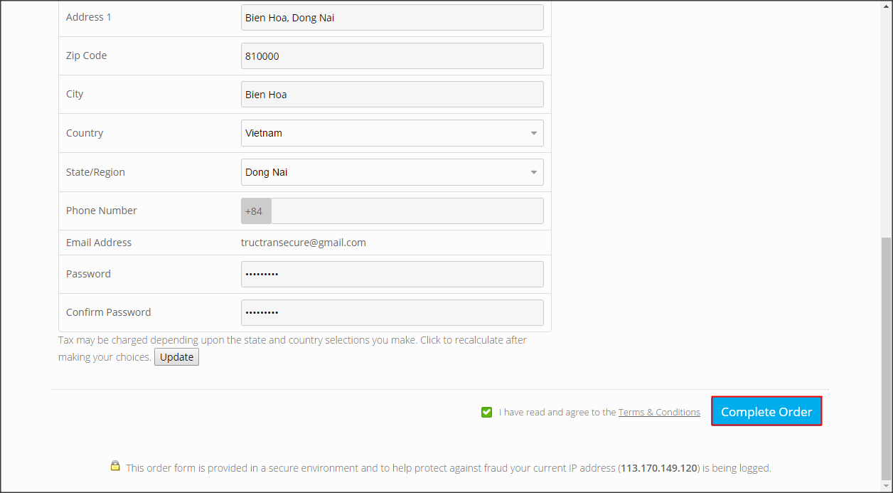 Sau khi bạn click link xác nhận, các bạn nhập thông tin theo yêu cầu và click Complete Order để hoàn tất phần thanh toán