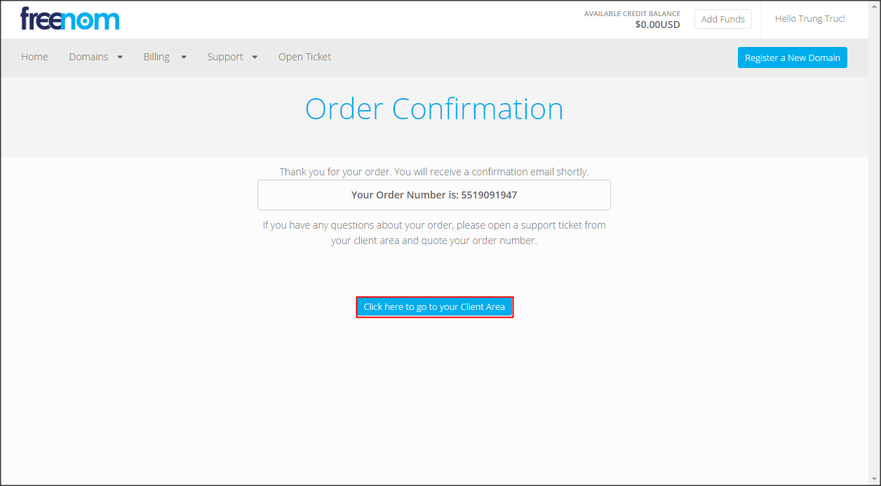 Hoàn tất, click vào nút Click here to go to your Client Area