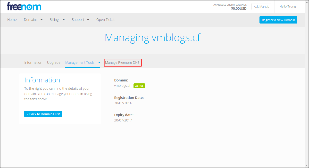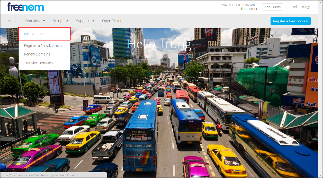 Chọn mục My Domains để quản lý tên miền của mình