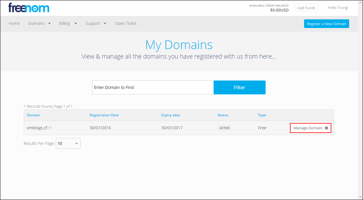 Tại danh sách tên miền, click chọn Manage Domain để tiếp tục