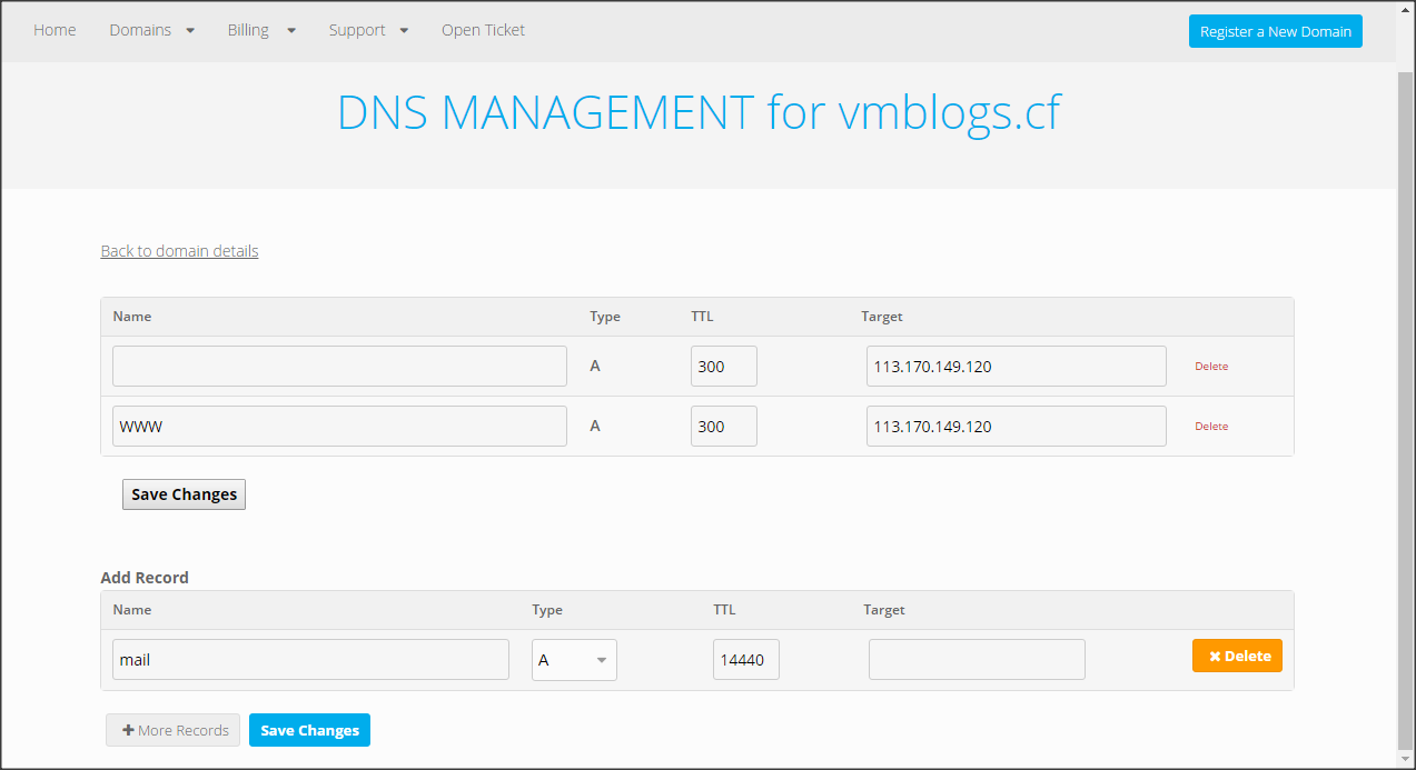 Các bạn có thể click nút Manage Freenom DNS để quản lý các record DNS