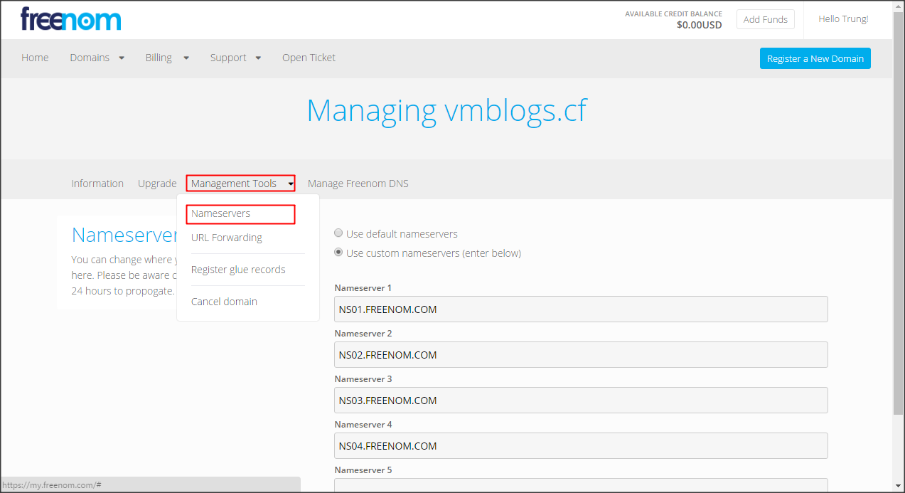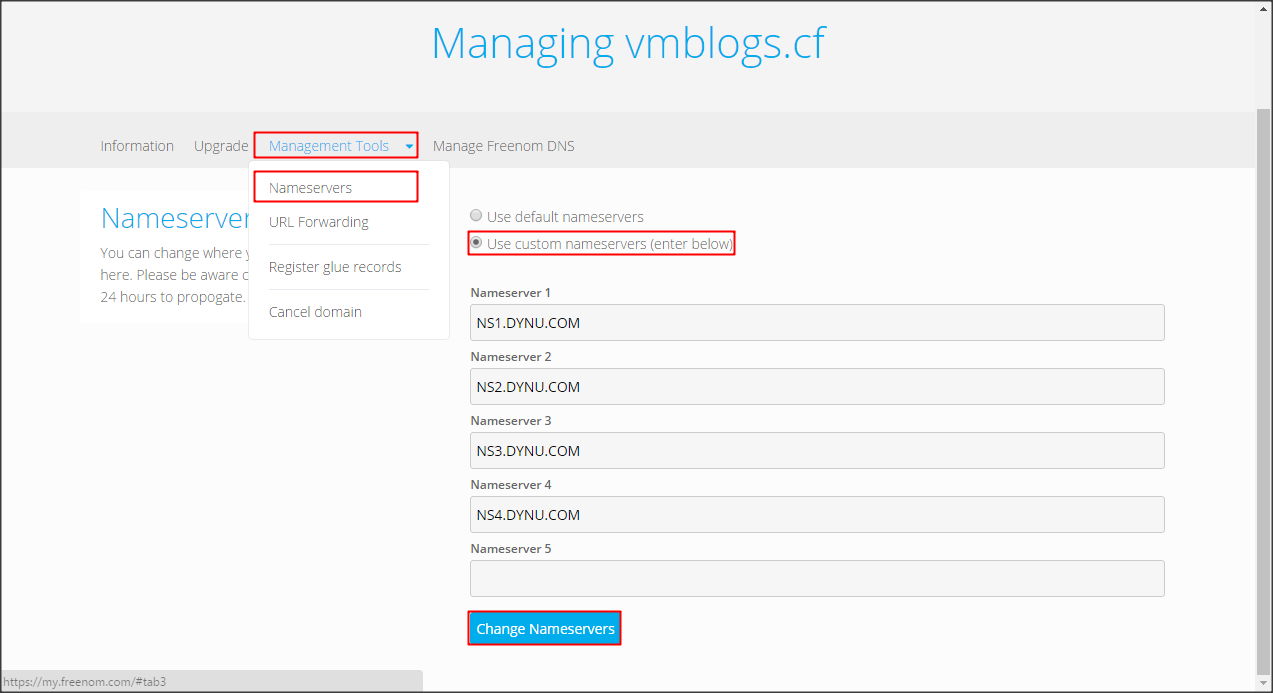 Chắc chắn rằng bạn trỏ DNS server ở Freenom về máy chủ DNS của Dynu.com
