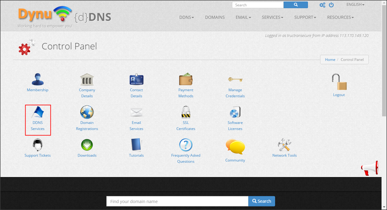 Khi bạn đã đăng ký thành công tài khoản Dynu.com, các bạn đăng nhập tài khoản và chuyển đến trang quản trị Control Panel.