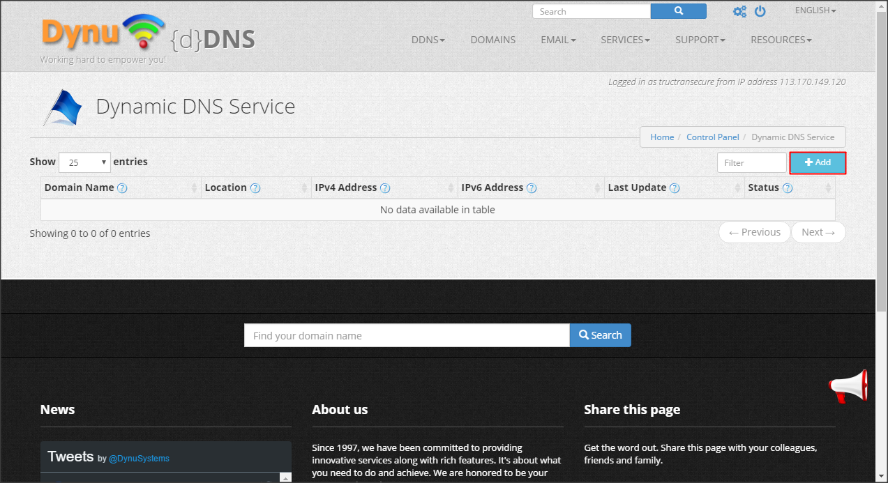 Để sử dụng dịch vụ của Dynu.com, các bạn vào trang chủ đăng ký một account và làm theo các bước hướng dẫn dưới đây để quản trị domain từ freenom và cập nhật IP tự động.