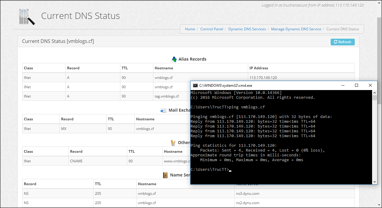 Sau khi đã thiết lập các bản ghi DNS, các bạn có thể kiểm tra trạng thái tại mục Current DNS Status