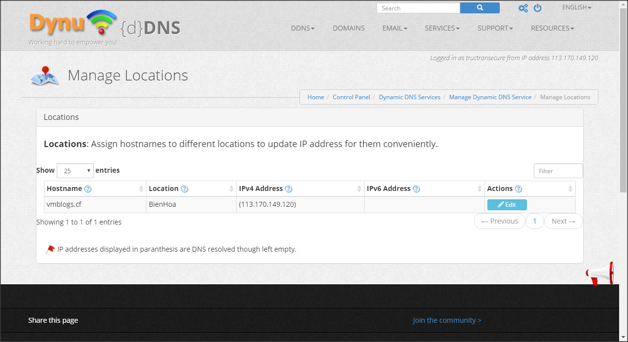 Phần Location giúp bạn quản lý các địa điểm sử dụng. Ví dụ Home, CN1, CN2, Truso…Location này giúp xác nhận IP theo từng địa điểm khi các bạn thiết lập thông tin trên tool Dynu IP Update Client của Dynu