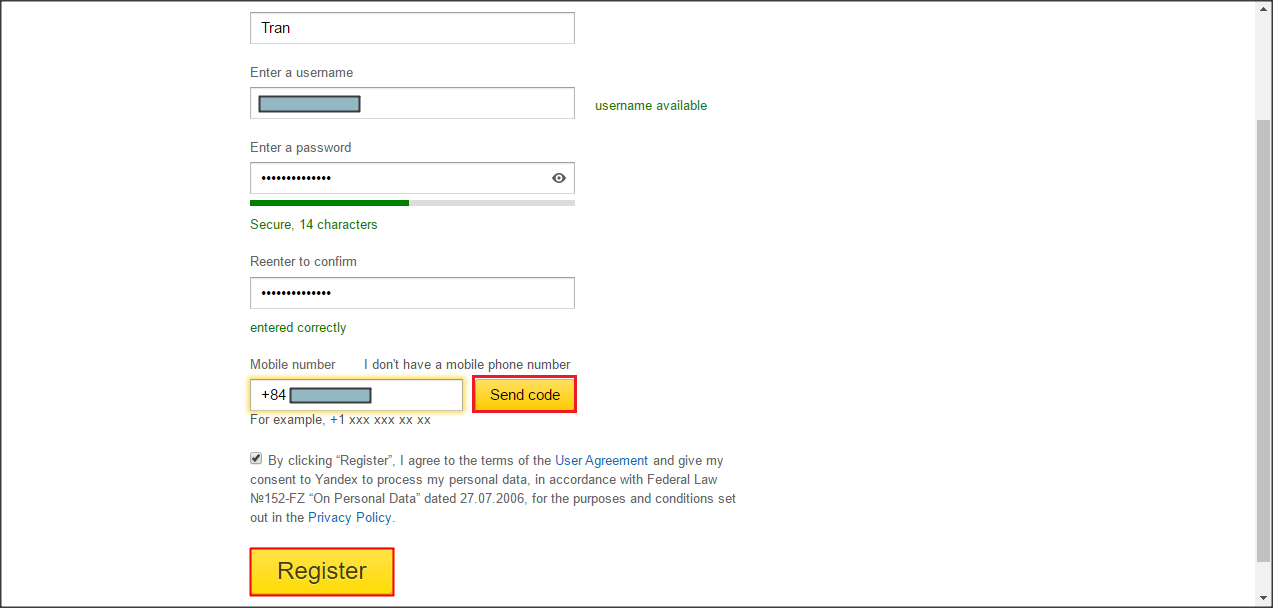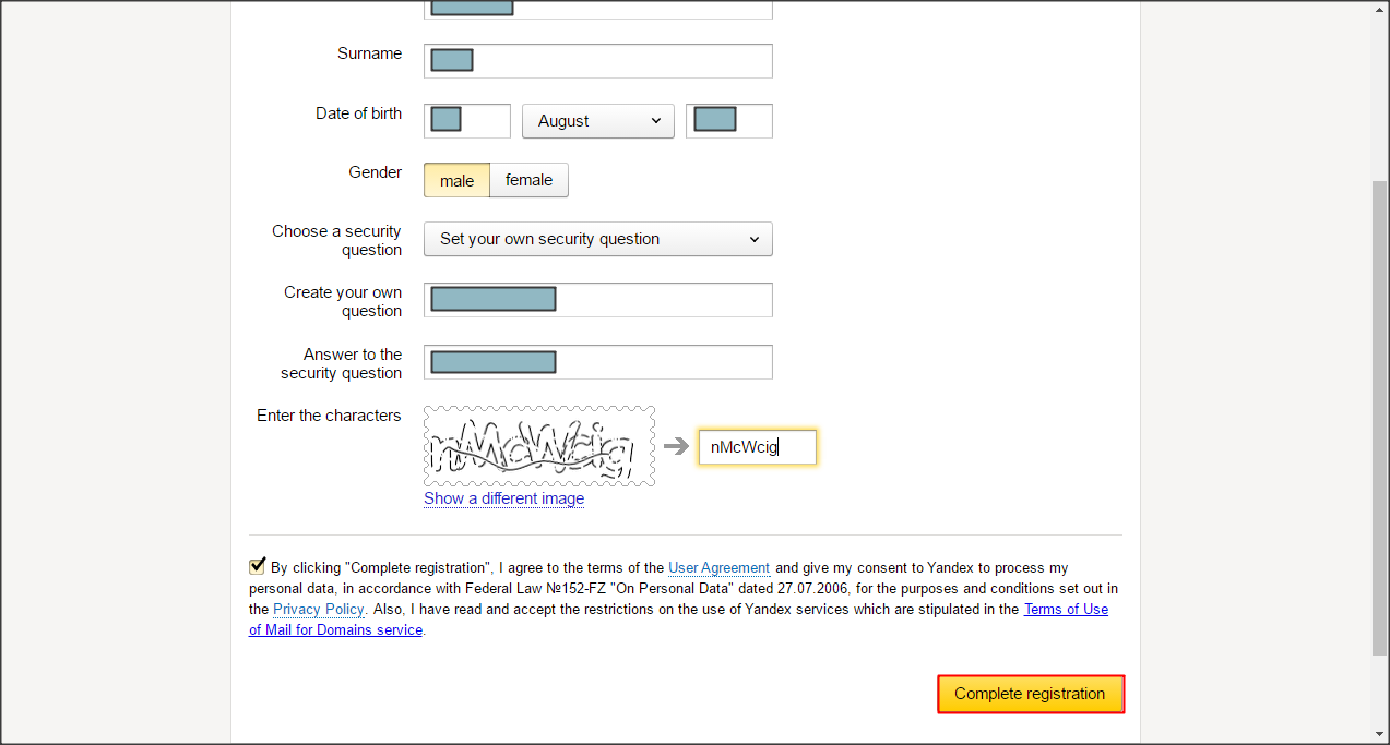 Sau khi đăng nhập bằng tài khoản mới tạo, Yandex sẽ yêu cầu bổ sung thông tin cá nhân cho tài khoản. Bổ sung theo yêu cầu, nhập mã Captcha và click Complete registration