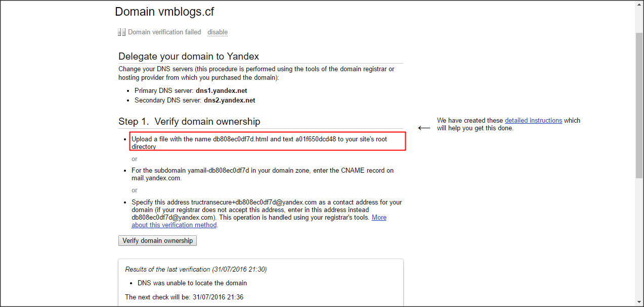 Yandex sẽ tiến hành xác minh tên miền của bạn, ban đầu họ sẽ báo lỗi, tuy nhiên sẽ được xử lý nhanh