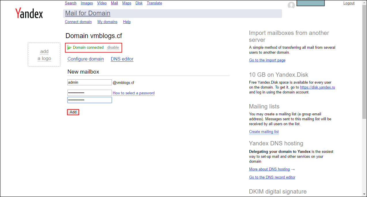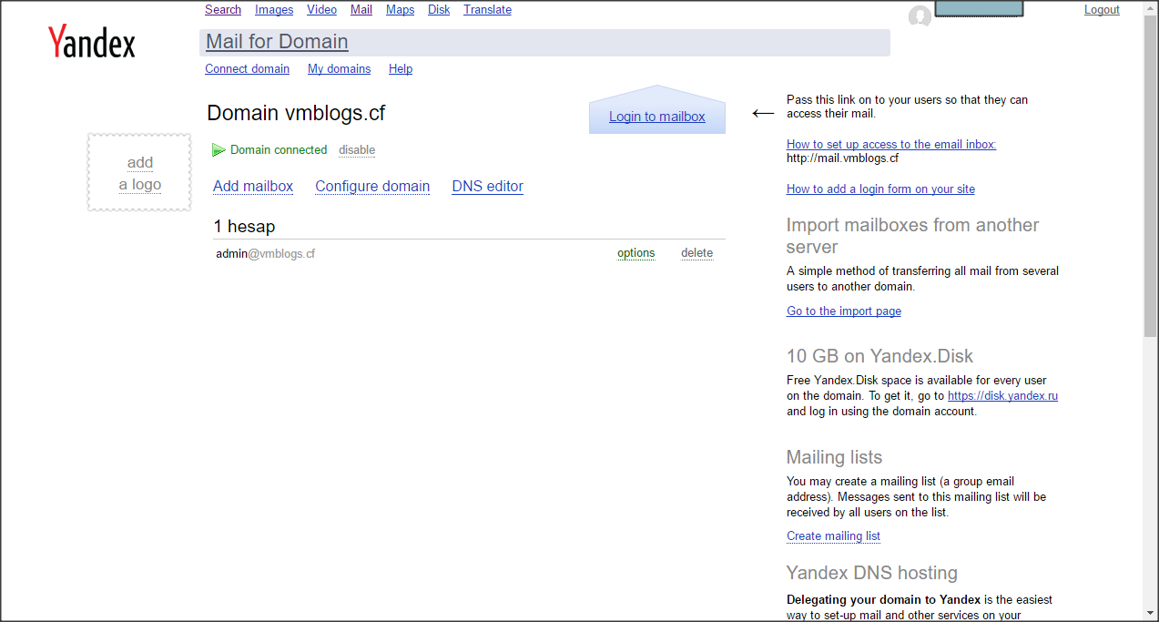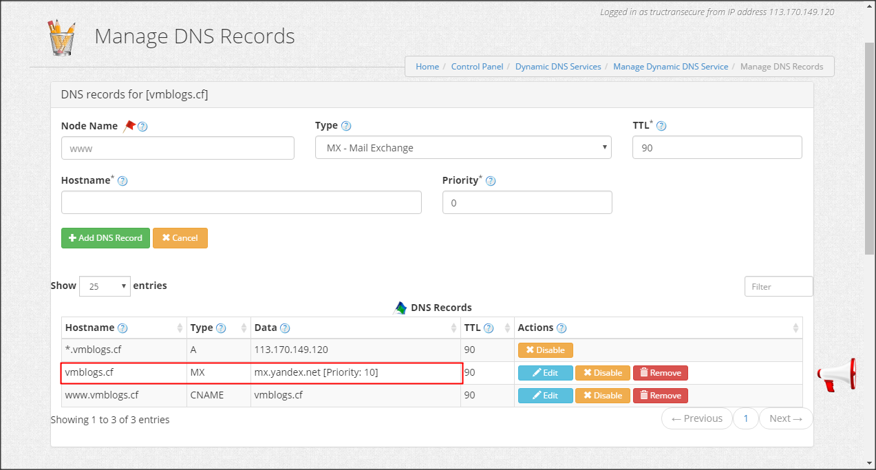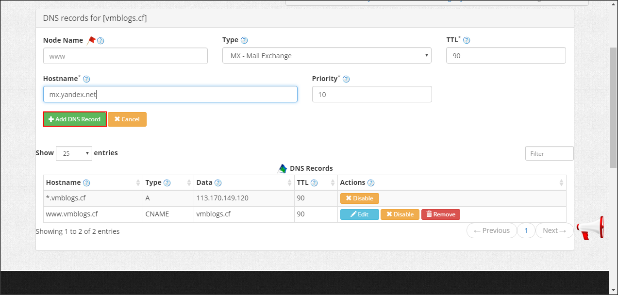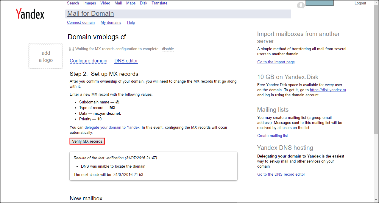 Mình cũng tạo một bản ghi MX theo hướng dẫn của Yandex để tiến hành xác minh MX record