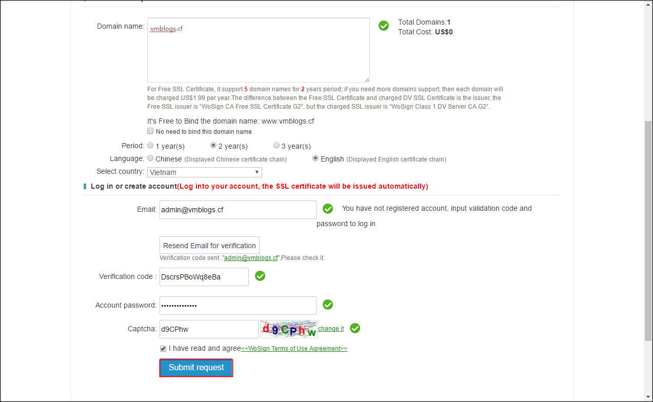 Có mã xác nhận rồi các bạn nhập mật khẩu cho tài khoản Wosign, nhập mã Captcha và click Submit Request