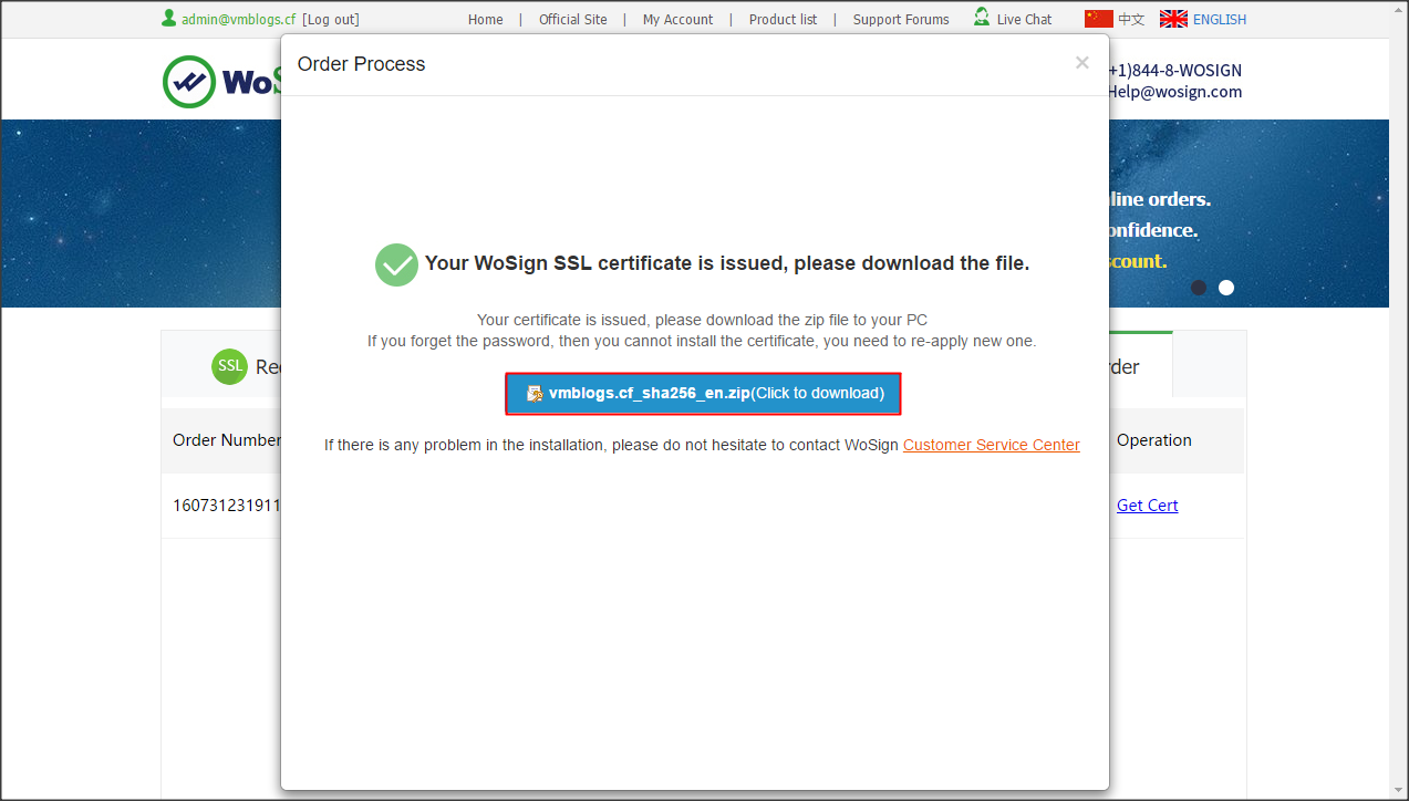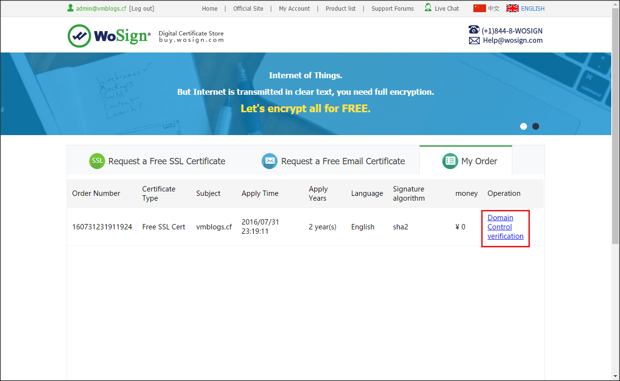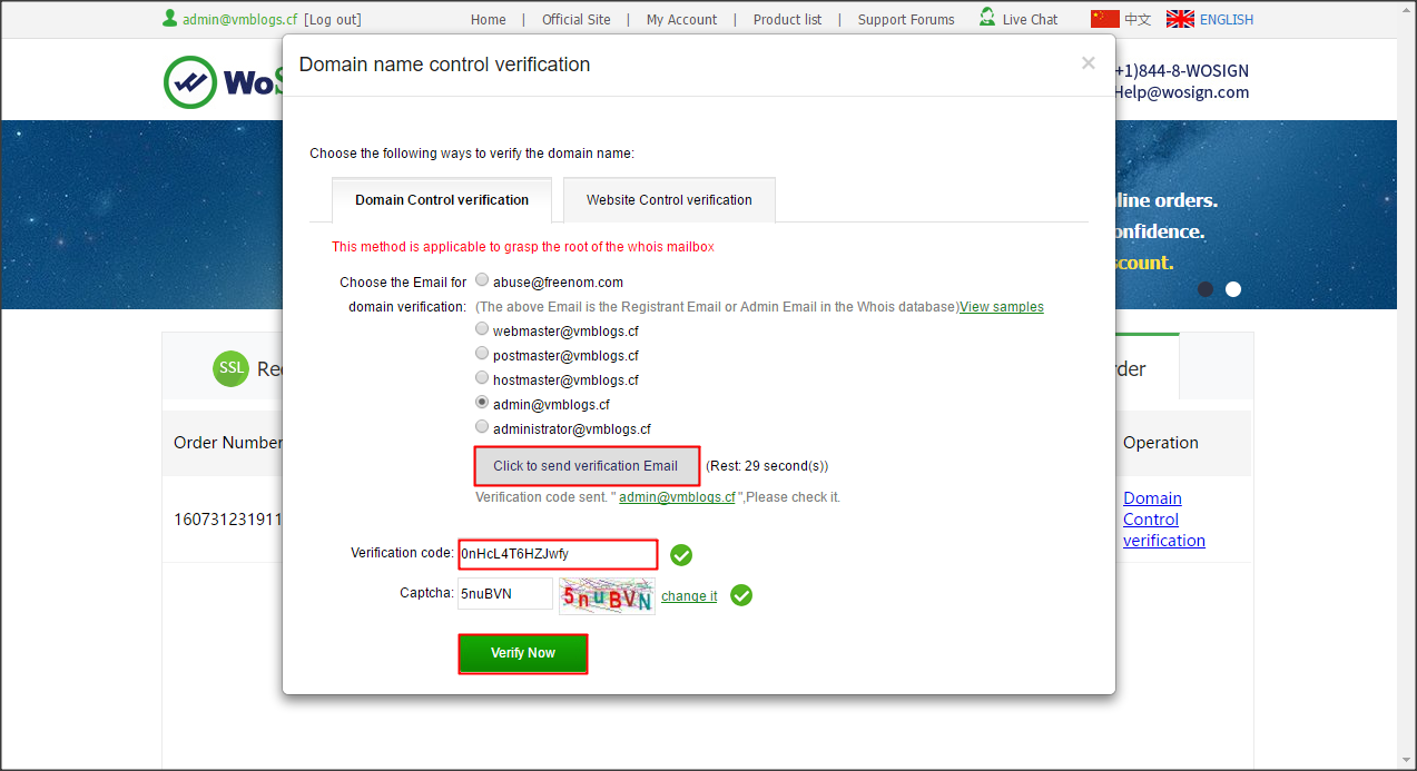 Có thể xác nhận domain thông qua email hoặc upload file lên trang web, do tài khoản admin@vmblogs.cf mình đã tạo trước đó nên mình dùng luôn địa chỉ email này để Wosign xác minh.