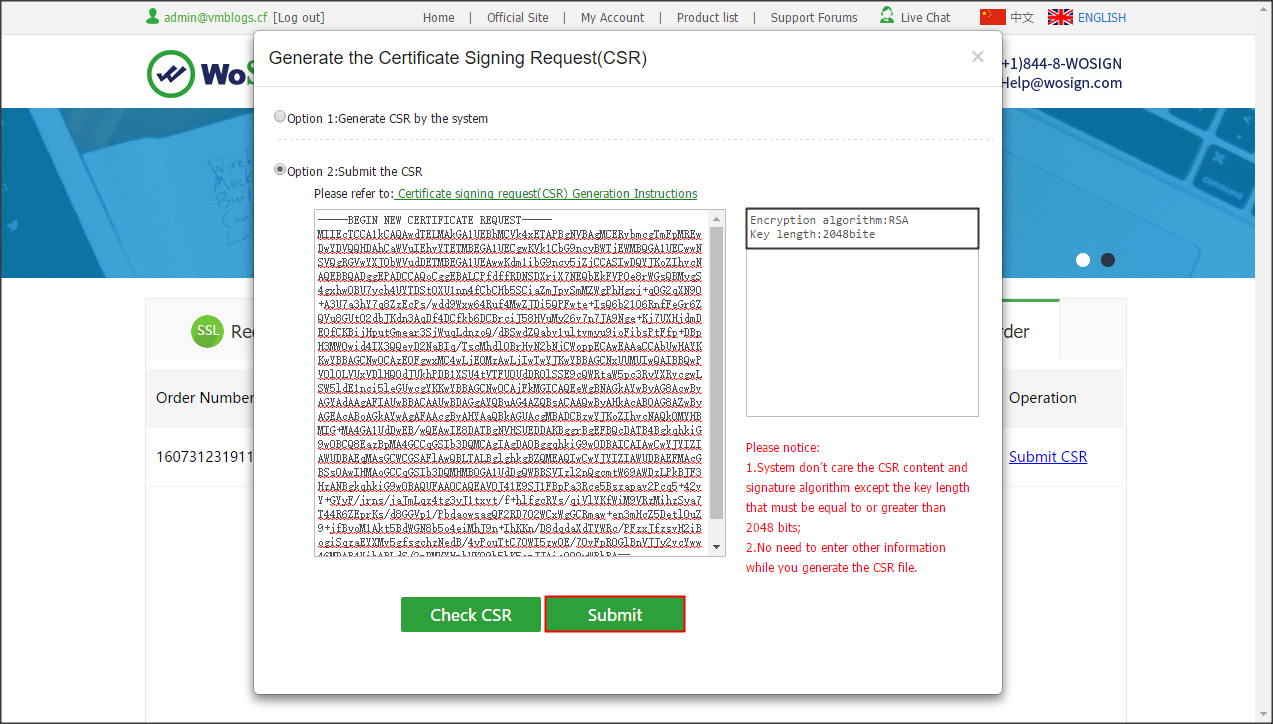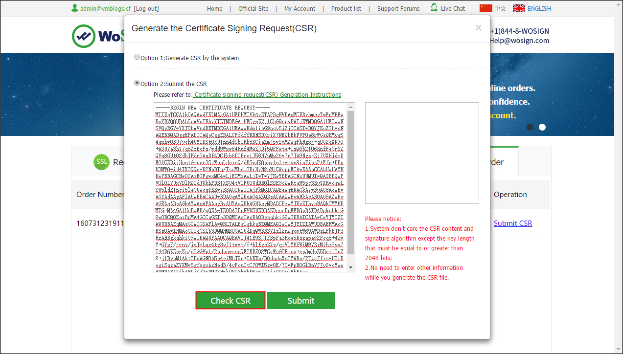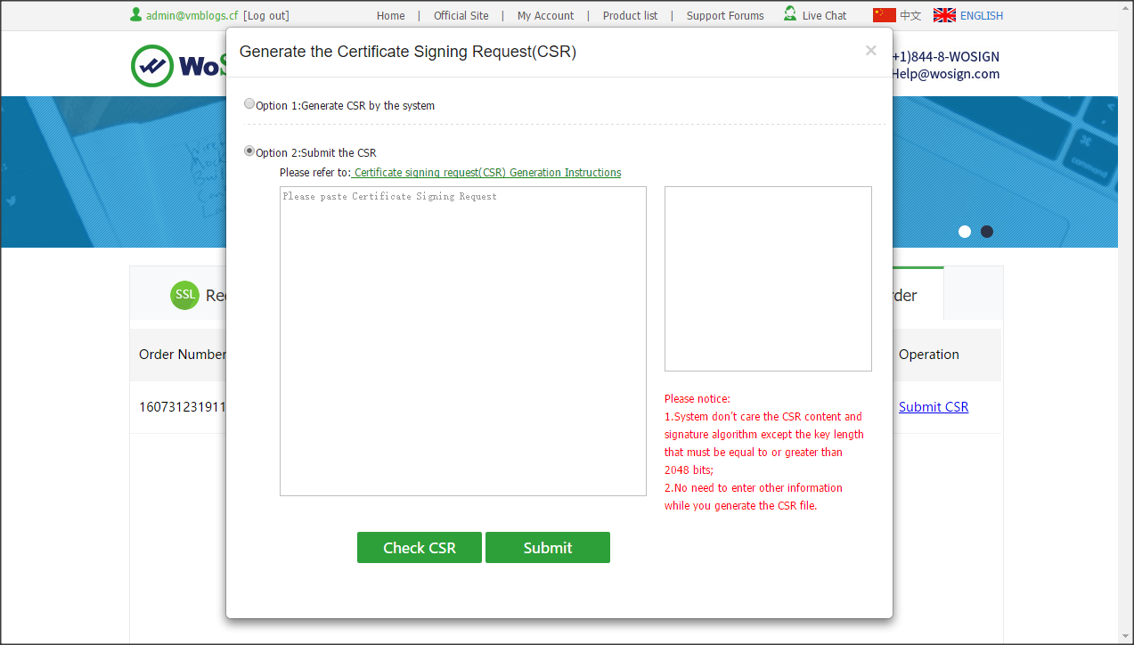 Sau khi hoàn tất xác minh tên miền, Wosign sẽ yêu cầu bạn dán nội dung yêu cầu cấp chứng chỉ số CSR