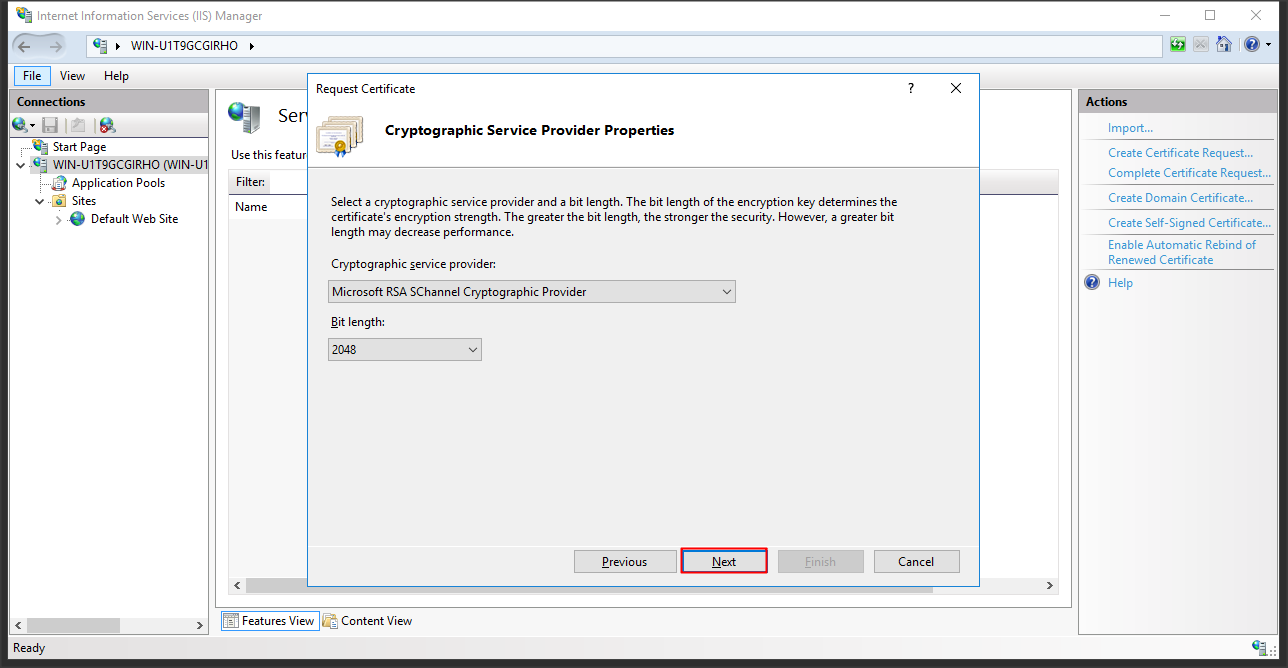 Chọn Microsoft RSA SCHANNEL và bitlength là 2048 => click Next