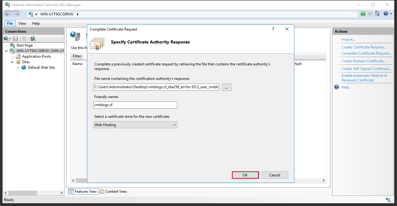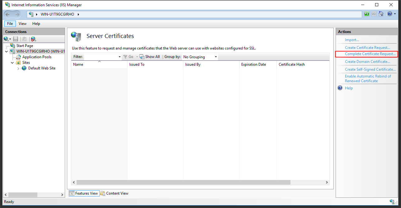 Quay trở lại IIS và click Complete Certificate Request