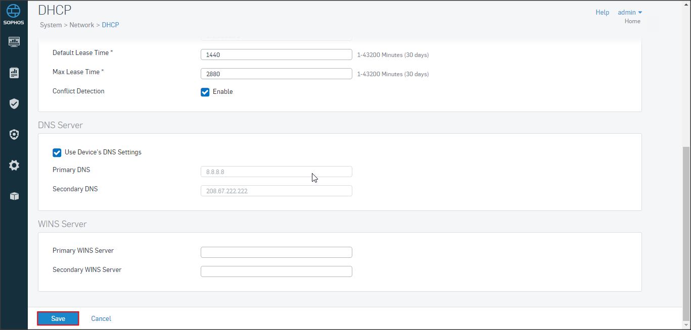 Cấu hình thời gian lease time cho DHCP, check Conflic Detection, cấu hình DNS tương ứng và lưu lại