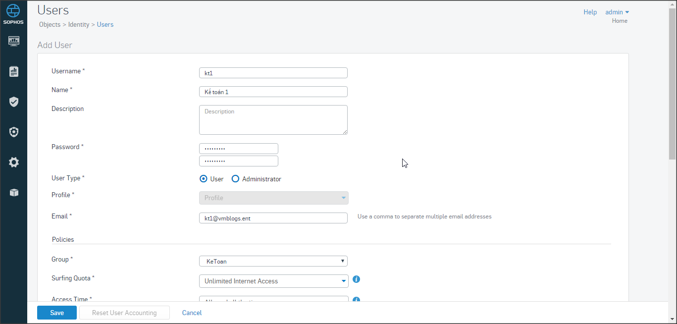 Nhập tên, mô tả, password, email (sử dụng trong trường hợp Quarantine Digest), nhóm tương ứng, chính sách truy cập…