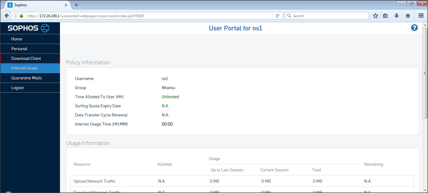 Sau khi đã login vào User Portal, user có thể xem thông tin tài khoản, tải Authentication client, xem mail bị chặn, sửa các thông tin cá nhân và theo dõi lưu lượng truy cập…